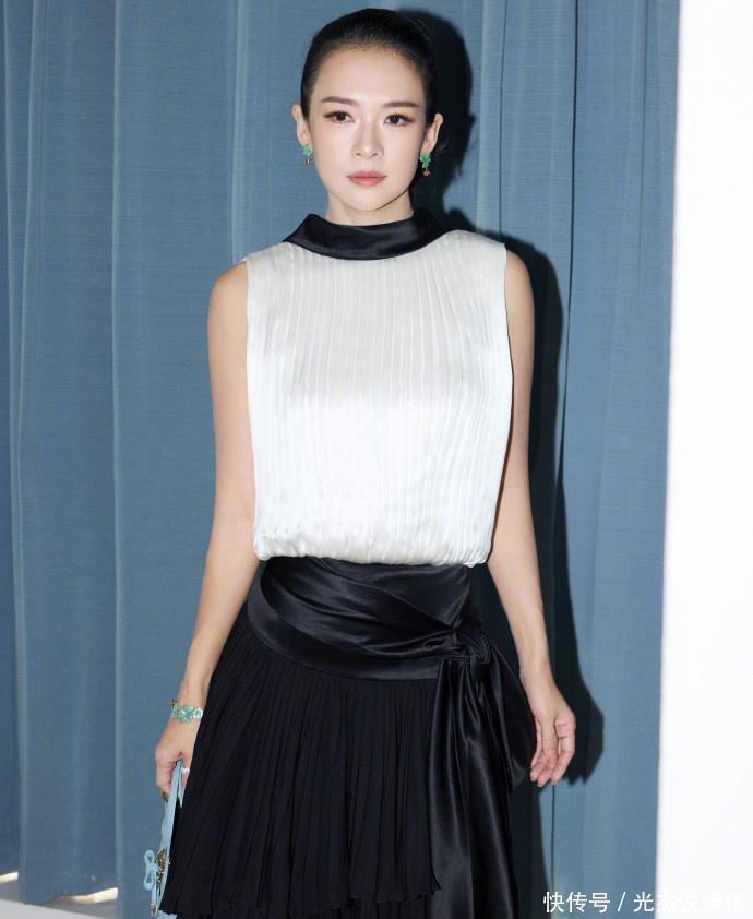 下身的丝绒半裙是这套造型的点睛之笔。丝绒面料自带细腻的肌理感光线照射下会呈现出柔和的光泽比普通缎面更显低调奢华。而且丝绒的垂坠感让裙摆自然垂落勾勒出章子怡纤细的腰线和修长的腿部线条同时半裙的长度及膝既保留了女性的柔美又不会显得拖沓。